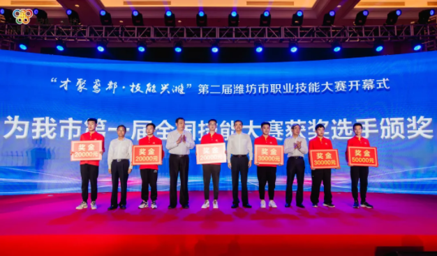 省人社厅、市政府、市人大、市政协领导为潍坊市参加第一届全国技能大赛获得前三名的选手颁发奖金,山东工业技师学院工业控制项目选手王明辉、水处理技术项目选手杜佩奇、可再生能源选手王风泽、印刷媒体技术项目选手赵常庚、管道与制暖项目选手马崇喜上台领奖。