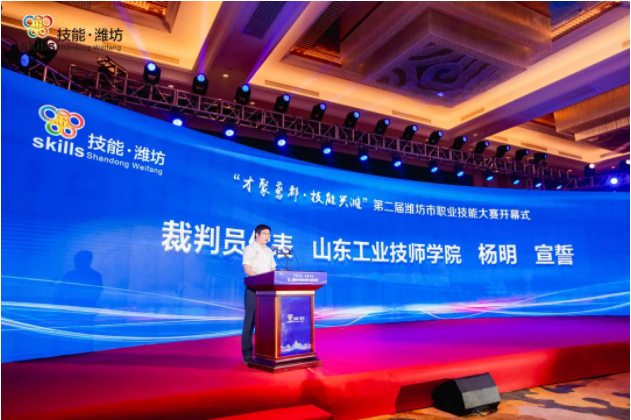 会上,山东工业技师学院水处理项目教练杨明教师作为裁判员代表宣誓。